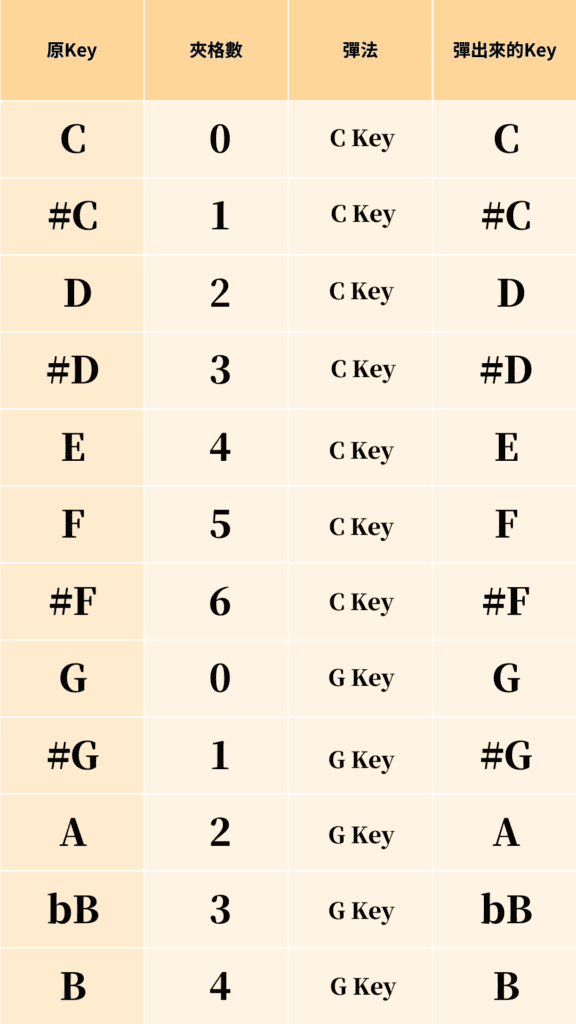 假設歌曲原調是「G大調」,所以如果要「彈G大調和弦」,就「不用夾」,但如果是「B♭大調」,就要「夾第三格」,因為G要到B♭,中間相「差三個半音」。